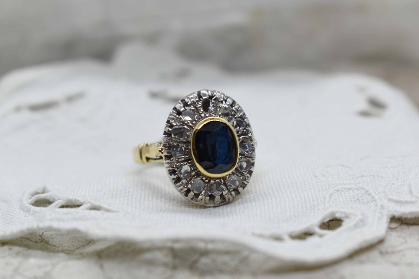 Anello vintage: zaffiro ovale e rose di diamante 0,40 ct