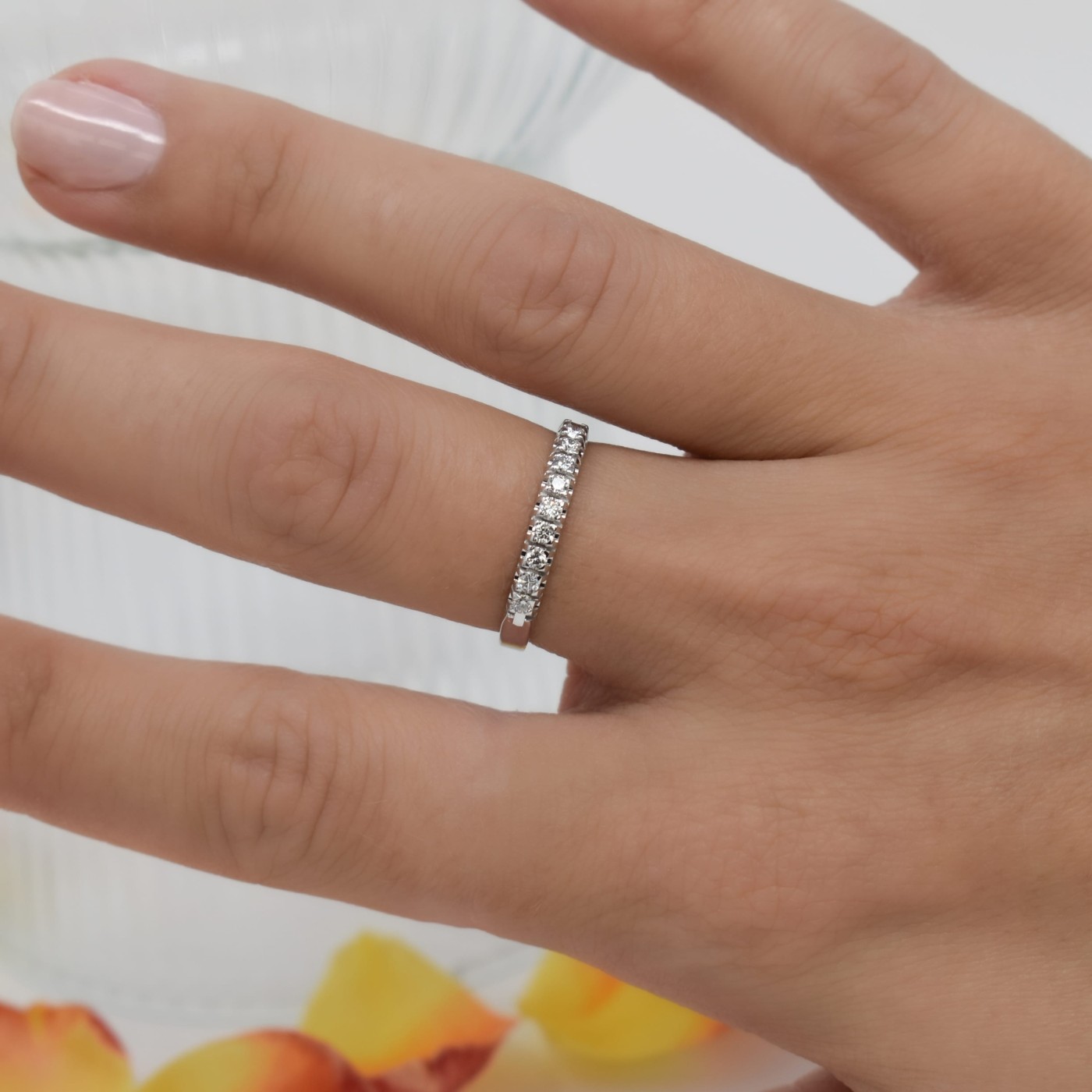 Realizzata dai nostri maestri orafi secondo la tradizione, questa preziosa fedina ha una montatura in oro bianco sovrastata da una corona di 9 diamanti bianchi da 0,22 ct ciascuno.