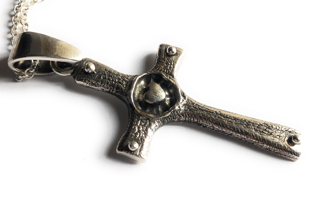 Splendida croce realizzata a mano con cuore centrale in argento 925 massiccio antichizzata e brunita nei dettagli effetto vissuto. La croce è completata di catena rolò loggata.